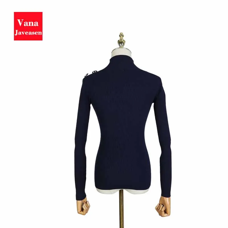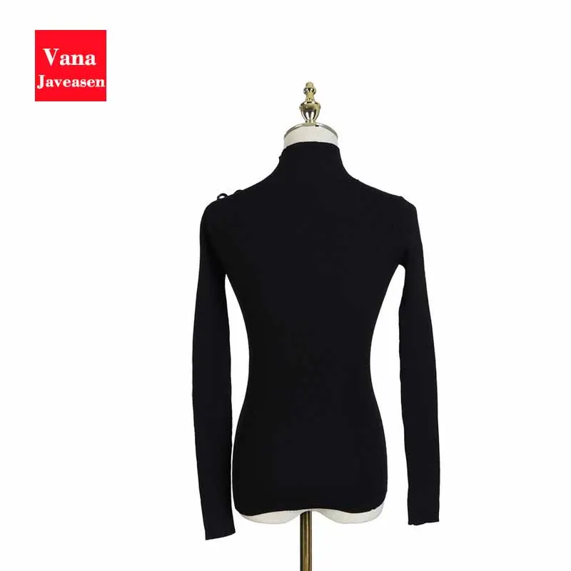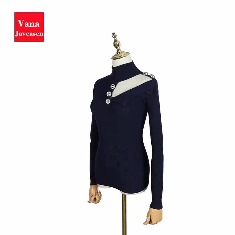 Hot Sale Button Design Hollow Out Knitted Sweater Women Clothing Turtleneck Long Sleeve Pullover Tops Women