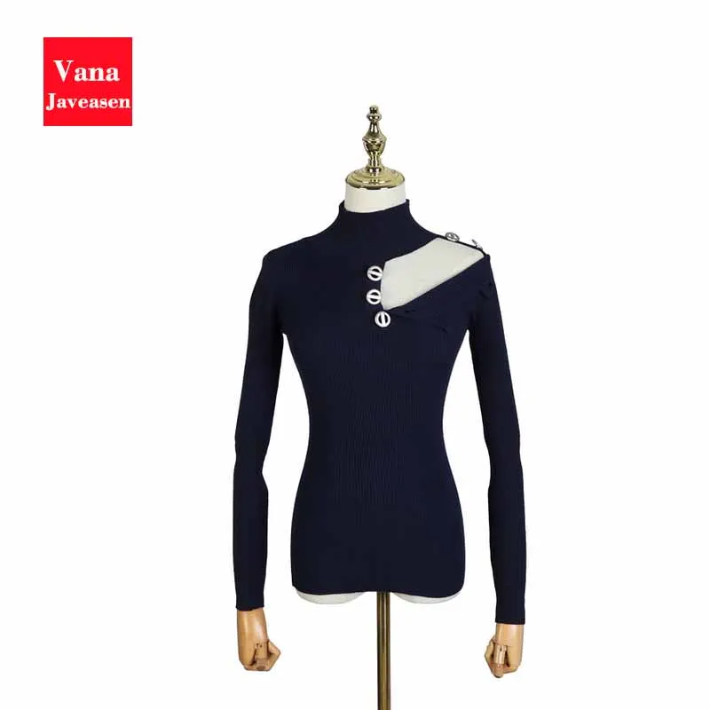 Flash Deal Button Design Hollow Out Knitted Sweater Women Clothing Turtleneck Long Sleeve Pullover Tops Women